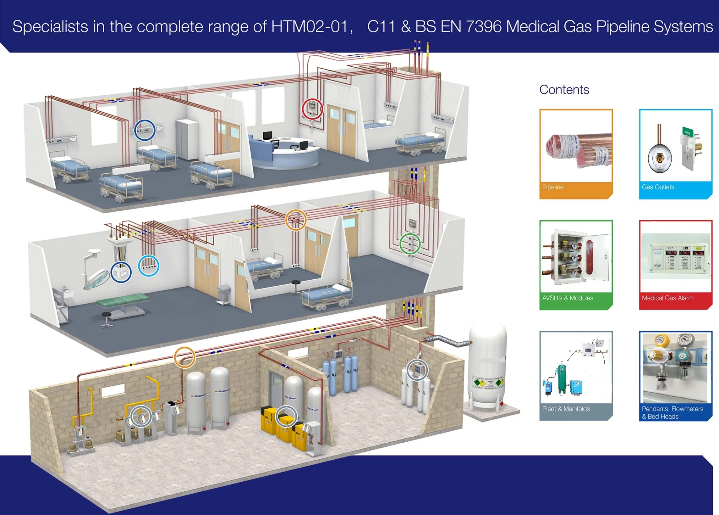 Centralized Medical Gas Pipeline System is a Vital and Integral part of a Modern Hospital, with emphasis on safety, reliability, and purity of the gases. The Central Piped Medical Gas System is one of the newer types of hospital plumbing systems that have been introduced to directly deliver different medical gases to the patients under care. Medical Gas Piping is needed for oxygen, nitrous oxide, medical air, nitrogen, carbon dioxide, vacuum, and instrumental air and waste anesthetic gas disposal. In Indian hospitals, generally, MGPS network is found only for oxygen, medical air, and vacuum.